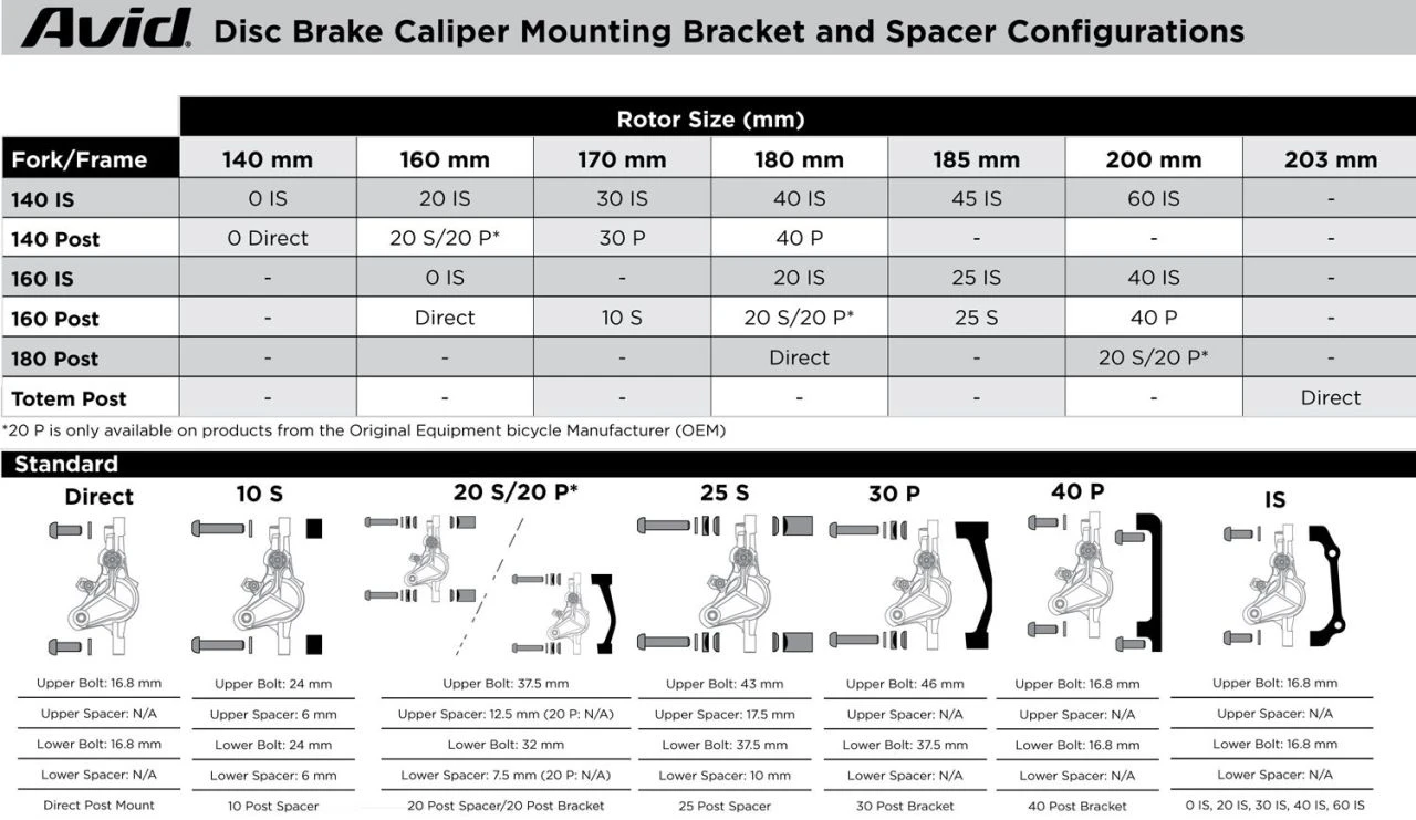 Todas las pinzas de freno Avid tienen el estándar Postmount. Mediante un adaptador, se pueden ajustar los frenos individualmente. Apto para disco de freno delantero de 160mm o disco de freno trasero de 140mm con estándar internacional. Con pernos de montaje.