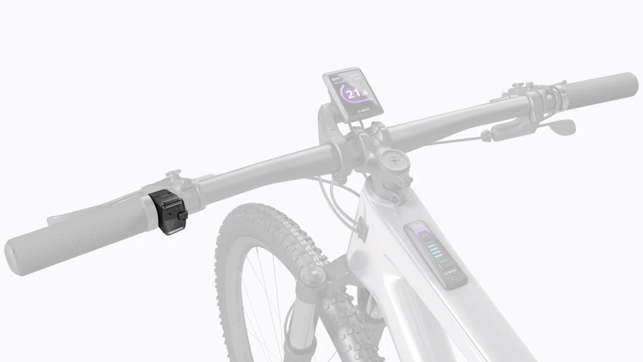 El Mini Remote de Bosch es un panel de control adicional que complementa al Controlador del Sistema, amplía la gama de funciones y permite un funcionamiento seguro. Se conecta al controlador del sistema mediante Bluetooth y puede montarse de forma flexible en el manillar. Gracias a los botones situados cerca del pulgar, las manos permanecen siempre en el manillar. Más botones significan más funciones: Con el Mini Remote obtendrá funciones prácticas como la asistencia inteligente al empuje y podrá encender y apagar la luz de su eBike.