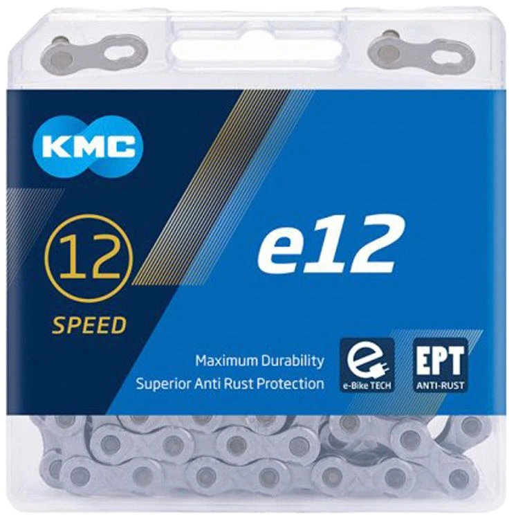 La cadena KMC E12 EPT e-bike con revestimiento EcoProTeQ y 130 eslabones para el motor central de la e-bike con un cambio de 12 velocidades.