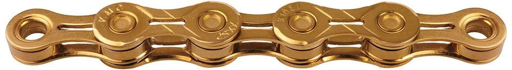 La cadena superligera X10EL Ti-N de 10 velocidades de KMC sin dependencia del sentido de la marcha y con un revestimiento superficial de oro de nitruro de titanio para sistemas de cambio de 10 velocidades.