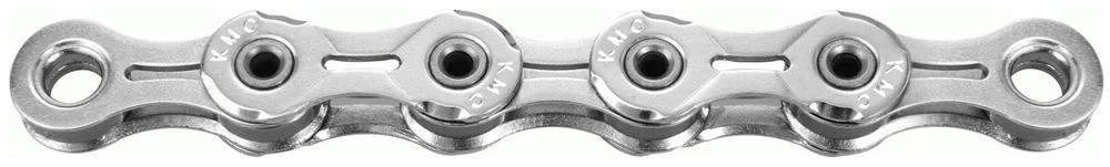 La cadena súper ligera X10SL de 10 velocidades de KMC sin dependencia del sentido de la marcha y con superficie niquelada para sistemas de cambio de 10 velocidades.