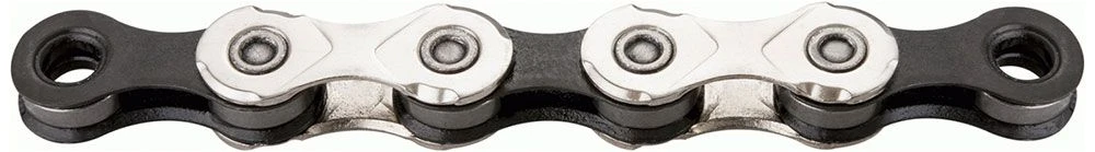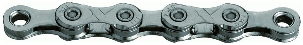 La cadena súper ligera X11 de 11 velocidades de KMC sin dependencia del sentido de la marcha y con placas exteriores niqueladas para sistemas de cambio de 11 velocidades.