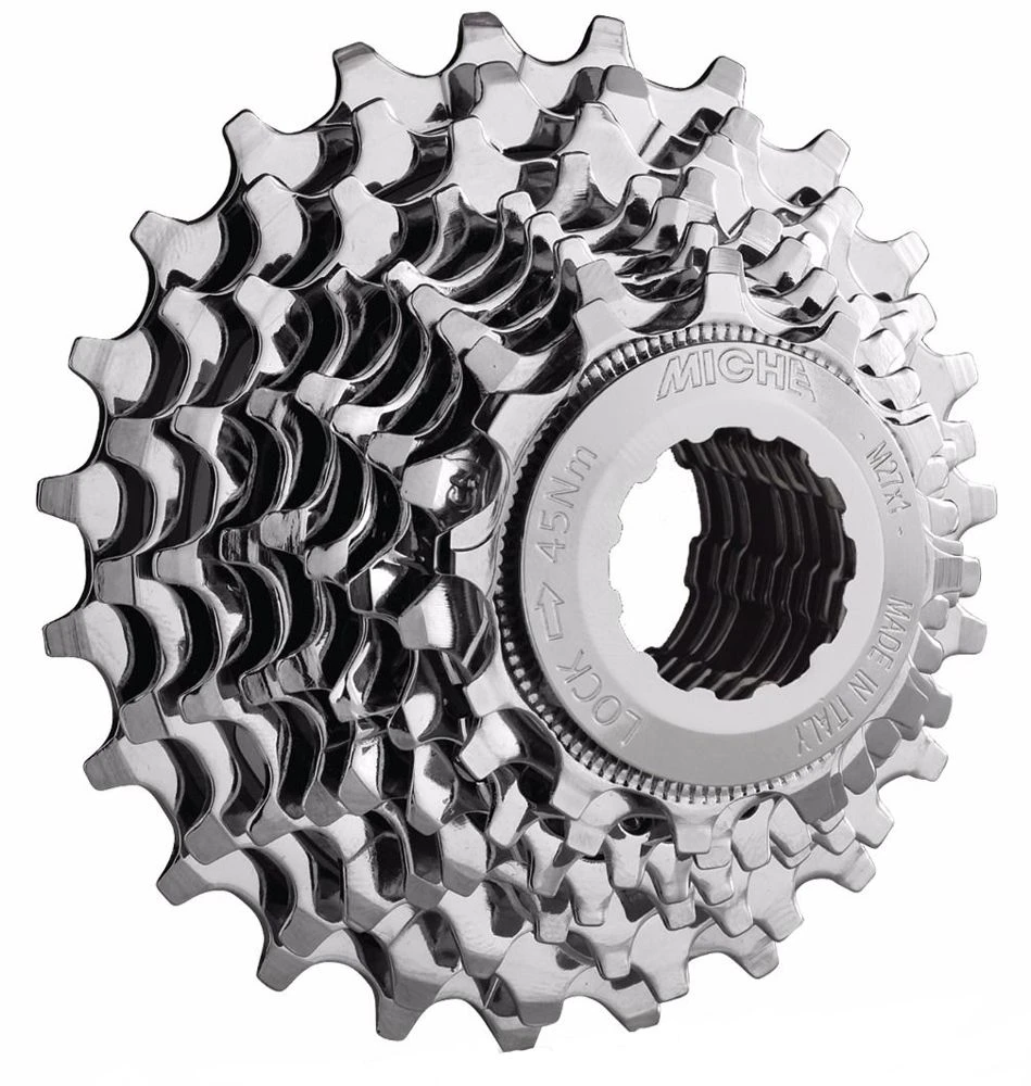 El casete de 9 velocidades de alta calidad de la serie Primato del fabricante italiano Miche es compatible con una rueda libre Campagnolo, así como con el cambio de 9 velocidades Campagnolo.