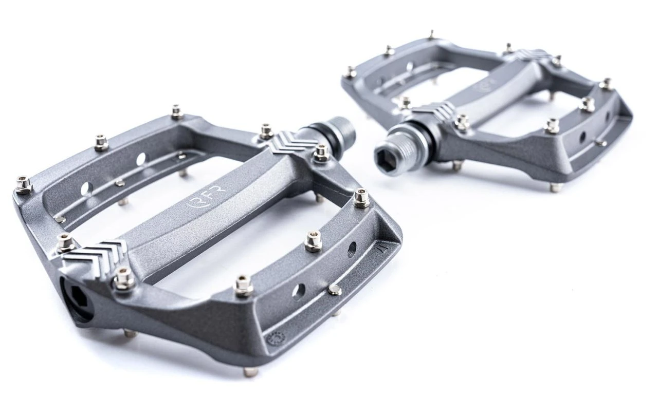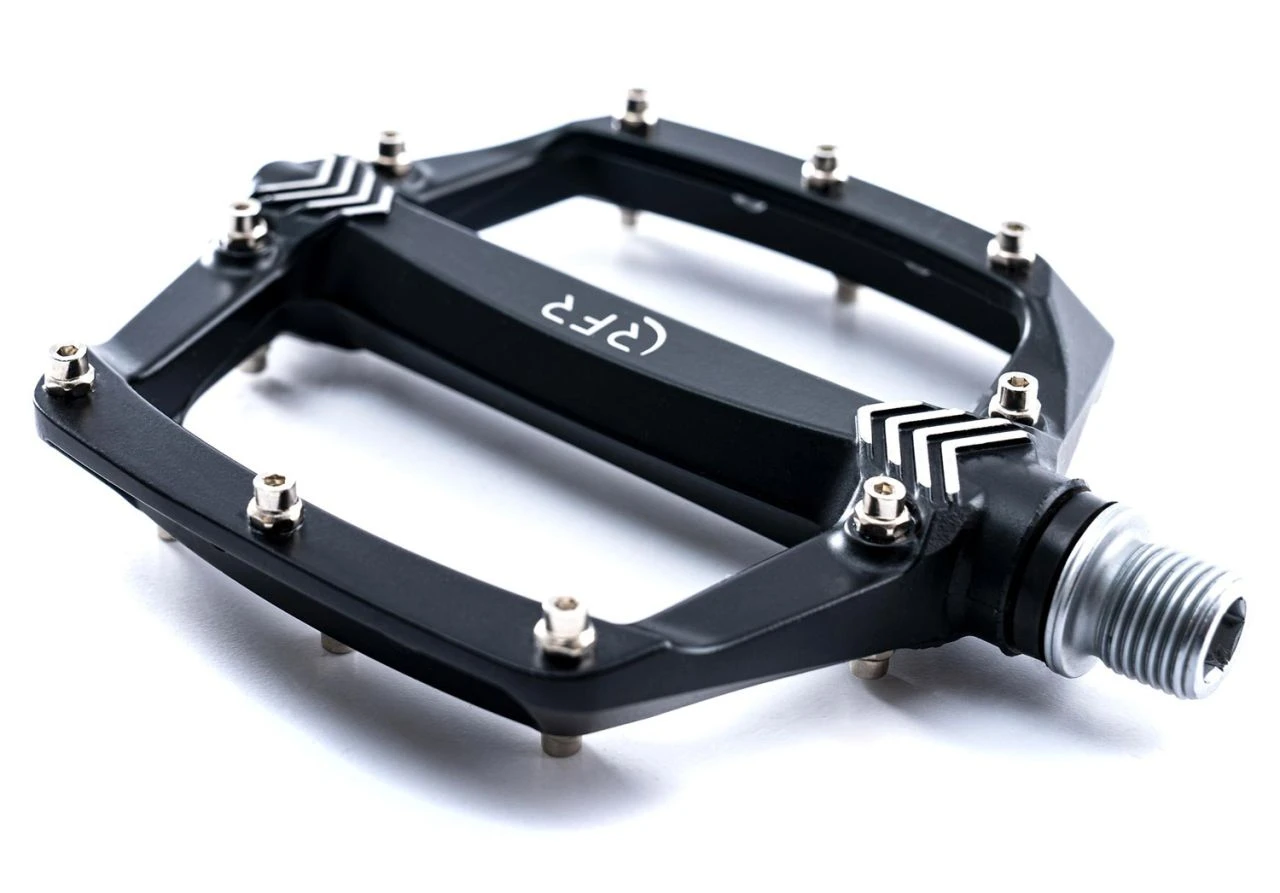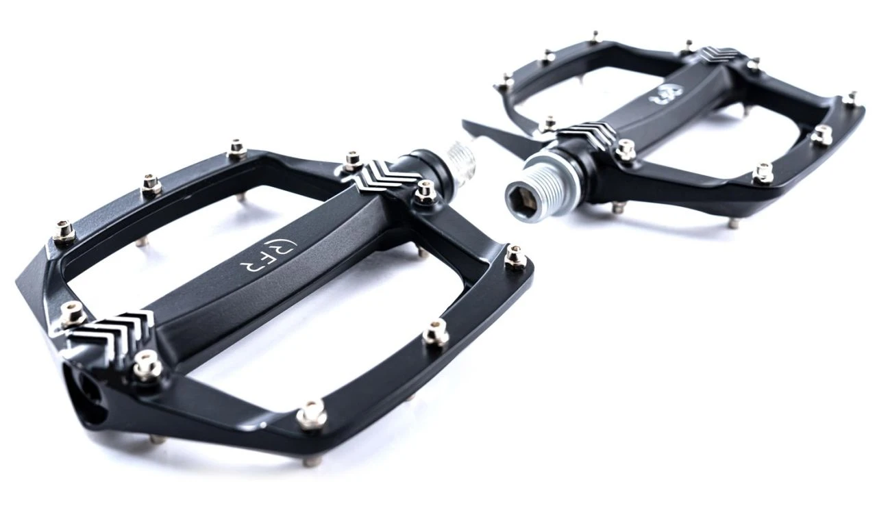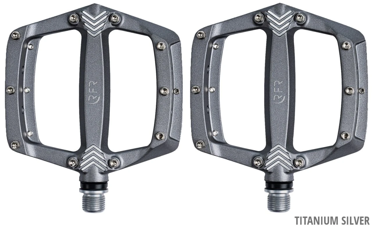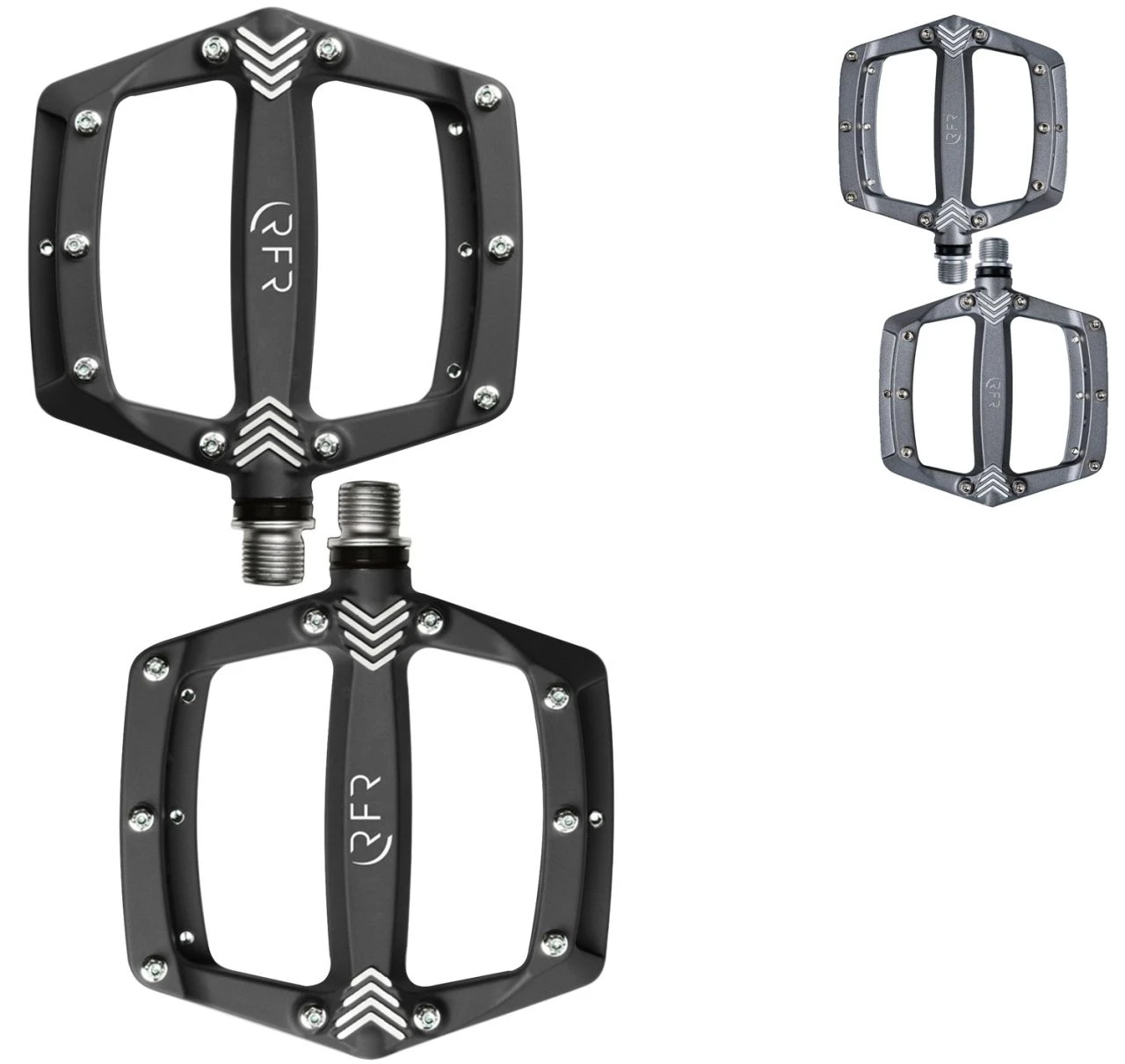 Los ligeros pedales planos RFR con perfil bajo, clavijas reemplazables, cuatro reflectores, rodamientos industriales y casquillo LSL.