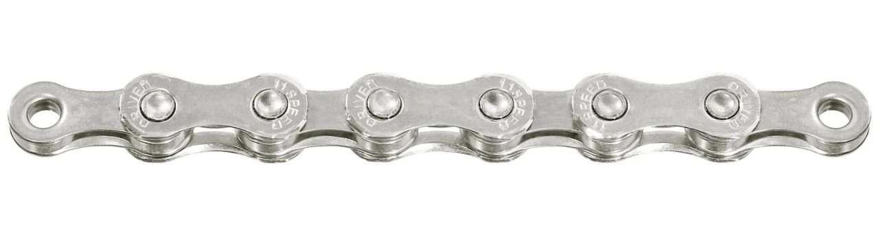 La cadena SunRace CN11A de 11 velocidades, especialmente resistente, para bicicletas de carretera y grava, tiene 116 eslabones y un cierre de cadena Easy-Link. Es compatible con transmisiones de 11 velocidades de Shimano, SRAM y Campagnolo.