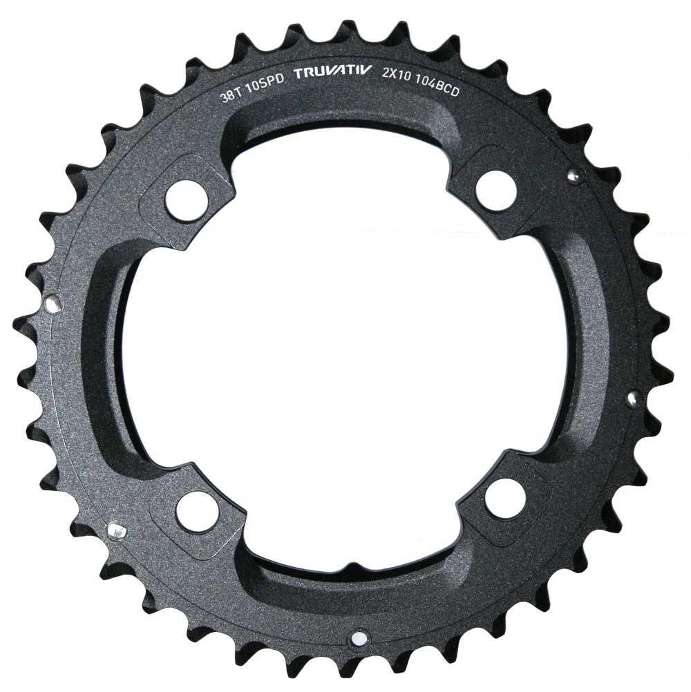 Plato de MTB Truvativ/SRAM con 38 dientes y círculo de tornillos de 104mm. Para bielas de 2×10 velocidades con una gradación de 24/38 dientes y un círculo de pernos de 64/104.